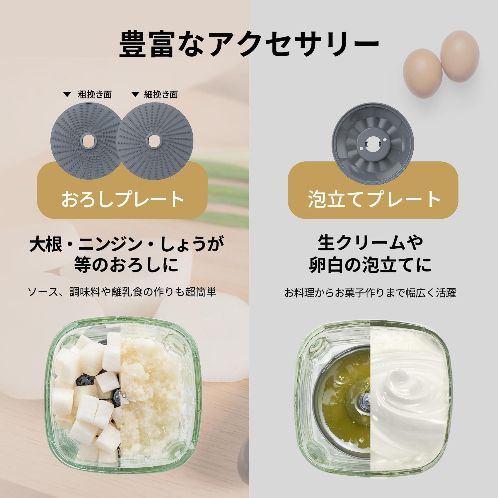 【大切な人への贈り物&日本企画安心】母の日や結婚祝い、料理好きの友人へのプレゼント、出産祝いとして贈るのにもぴったり。本製品のお買い上げ日より1年間の期間がついております。商品の不良や要望・質問などがございましたら、いつでもお気軽にお問合せください。【素敵なセット内容】フードプロセッサー本体×1、ガラスボウル×1、ブレード×1、泡立てプレート×1、両面おろしプレート×1、USB充電ケーブル(約0.5m)×1、日本語説明書×1。