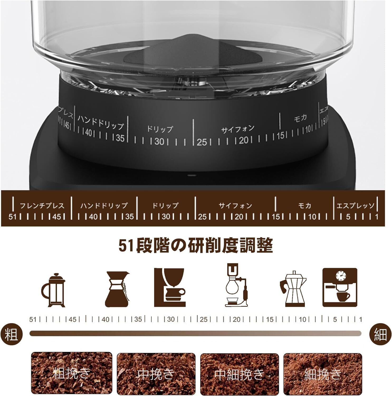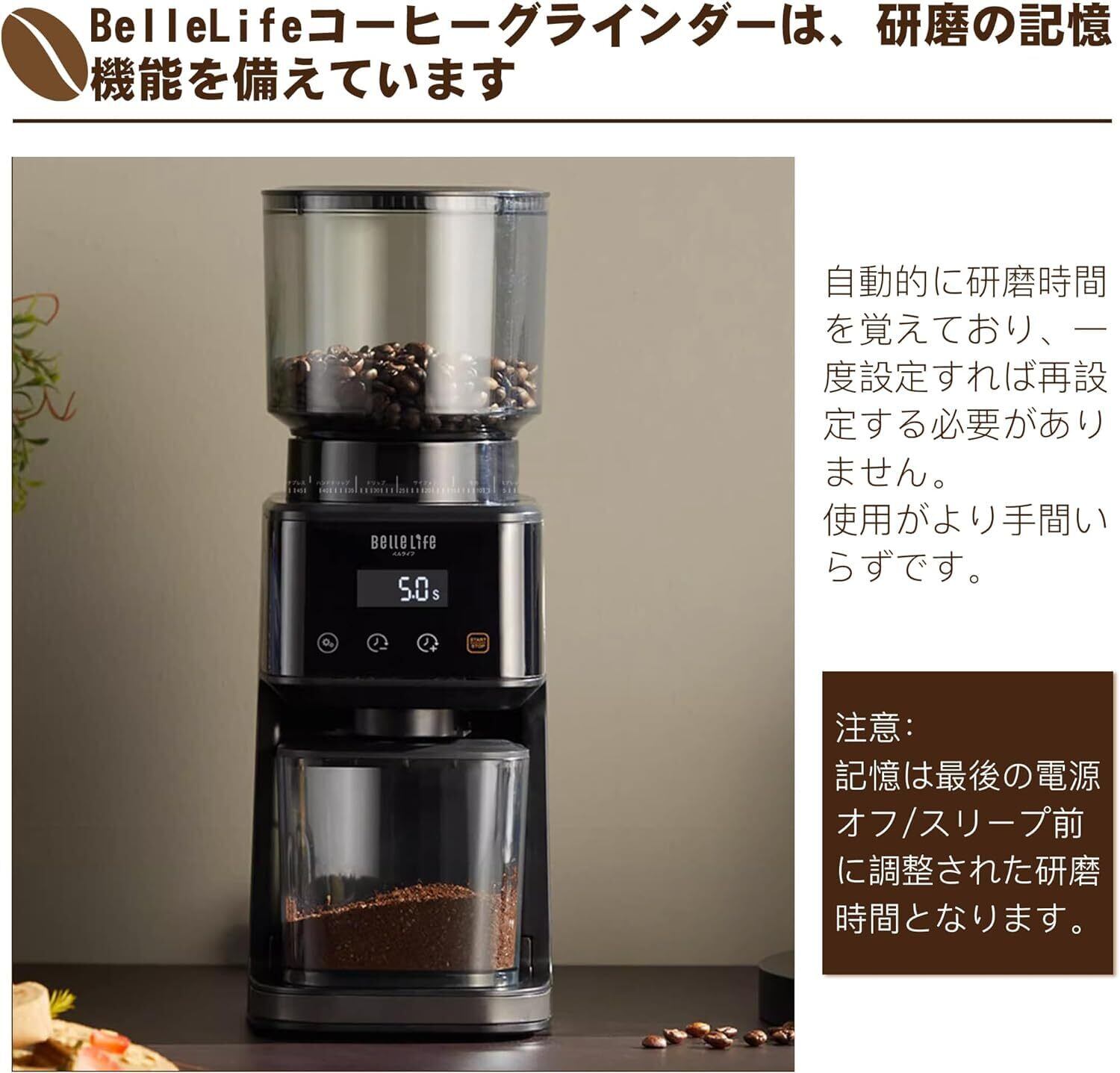 【粉が飛び散らず】コーヒーミル 電動 BelleLife コーヒーグラインダー コーン式コーヒーグラインダー 粒度51段階設定 静電気飛散防止 大容量 メモリー機能 粉叩き器付 掃除ブラシ付