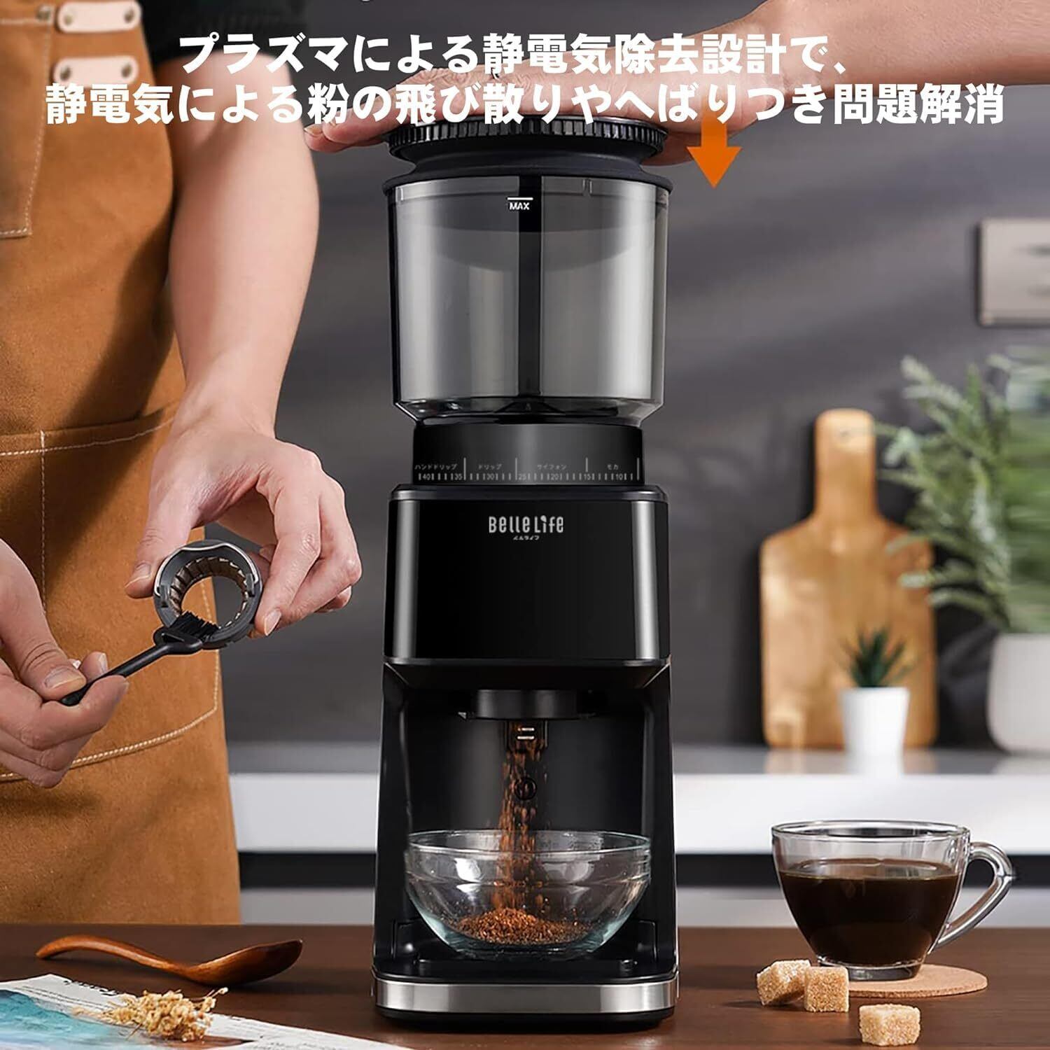【粉が飛び散らず】コーヒーミル 電動 BelleLife コーヒーグラインダー コーン式コーヒーグラインダー 粒度51段階設定 静電気飛散防止 大容量 メモリー機能 粉叩き器付 掃除ブラシ付 | Lulu