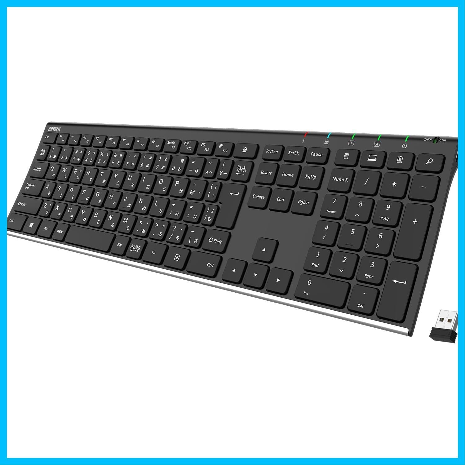 Arteck 2.4G ワイヤレスキーボード日本語配列 無線ステンレススチール 軽量 フルサイズキーボード テンキー付き コンピューター、デスクトップ、PC、ラップトップ、Surface、スマートテレビ、Windows10/8/7、Vista、XPとの性あり 充電式電池内蔵