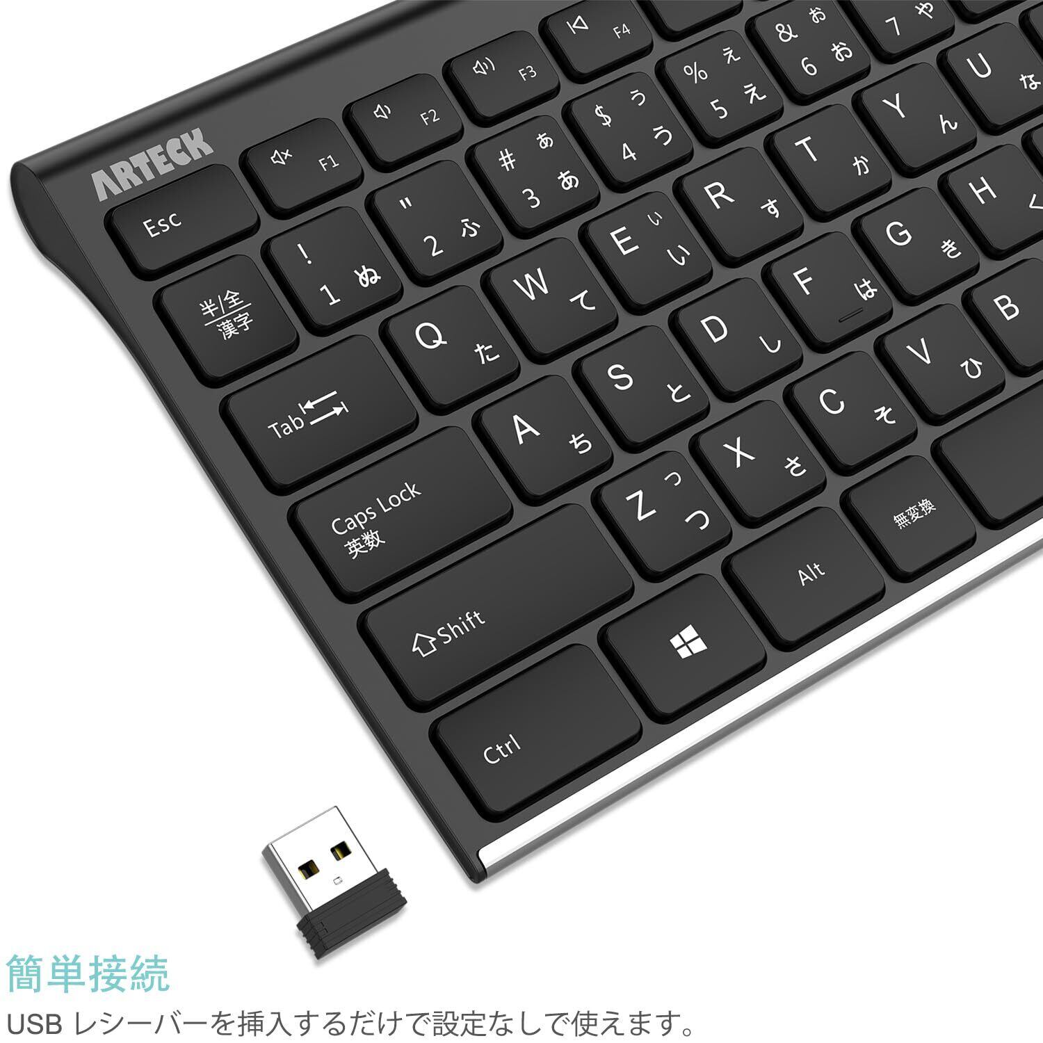 製品内容:Arteck2.4G無線キーボード、USBレシーバー、USB充電ケーブル、ユーザーマニュアル、そして弊社人気の2年間のと親身なカスターマーサービスが付きます。