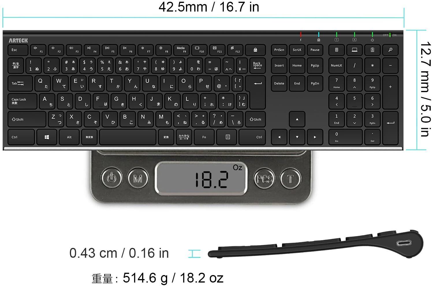 超軽量、薄型デザイン:コンパクトサイズ「16.9 X 4.9 X 0.6インチ」と軽い重量「14.9オンス/422.4g」、フルサイズで矢印キー、ショートカットキー、テンキーが付き、快適なタイピングが可能です。