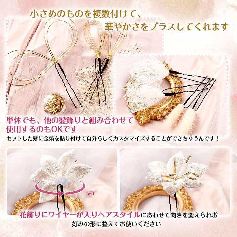 【和装髪飾りセット内容】髪飾12点セット。Uピン仕様の髪飾りは簡単に取り付けられやすいです。ピンは曲げることも出来ます。小さめのものを複数付けて、どの方向から写真を撮っても映えるようにするのも可愛いですね。綺麗に梱包しますので、新年、誕生日、クリスマス、バレンタインデーギフトとしてお勧めます。浴衣や着物などの和服だけでなく、普段使いにも便利な一本タイプです。