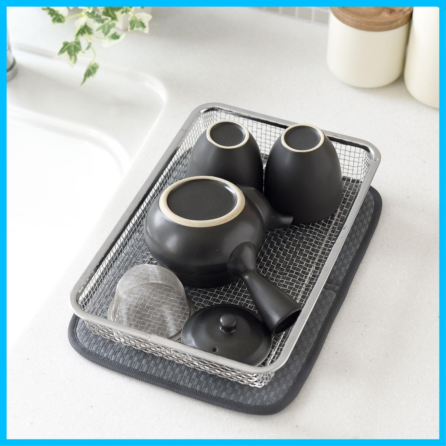 【脚付き・目が細かいメッシュ】脚付きなので通気性が良く衛生的で、乾きも早いです。脚を使って引っ掛け収納もできます。目が細かいのでカトラリーや箸類、お弁当のカップなど、小さなものも落ちる事がなく使用できます。