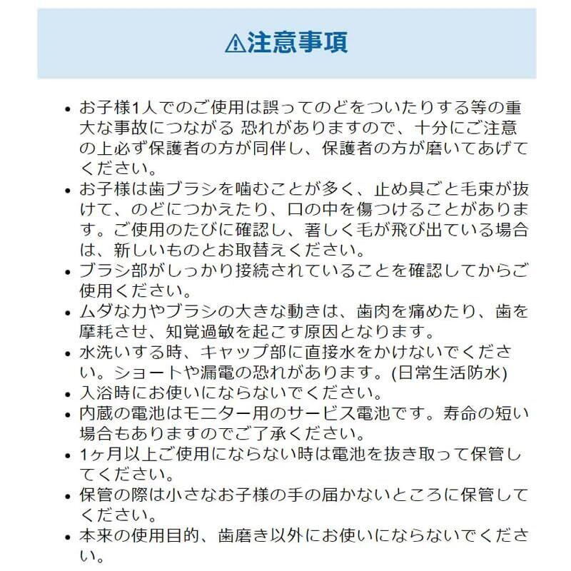 ●お子様1人でのご使用は誤ってのどをついたりする等の重大な事故につながる恐れがありますので、十分にご注意の上必ず保護者の方が同伴し、保護者の方が磨いてあげてください。