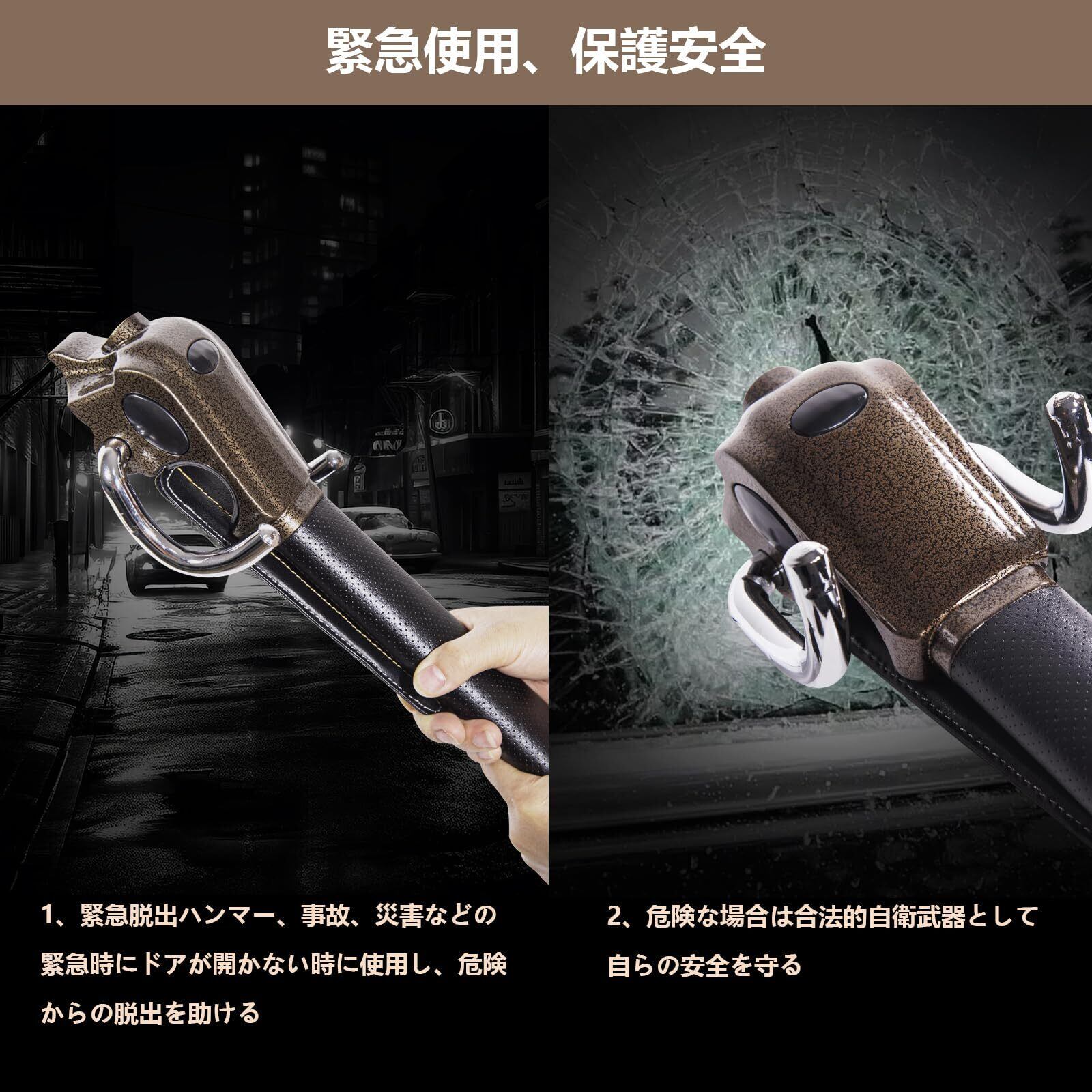 【緊急脱出ハンマー機能】:特殊先端設計の頭部は、鋭利な点を持たず、人と愛車を傷つけないようにしているが、伝統的な扁平設計より爆発力が強く、破窓ハンマーとして使用でき、事故、災害などの緊急時にドアが開かない場合に使用される。