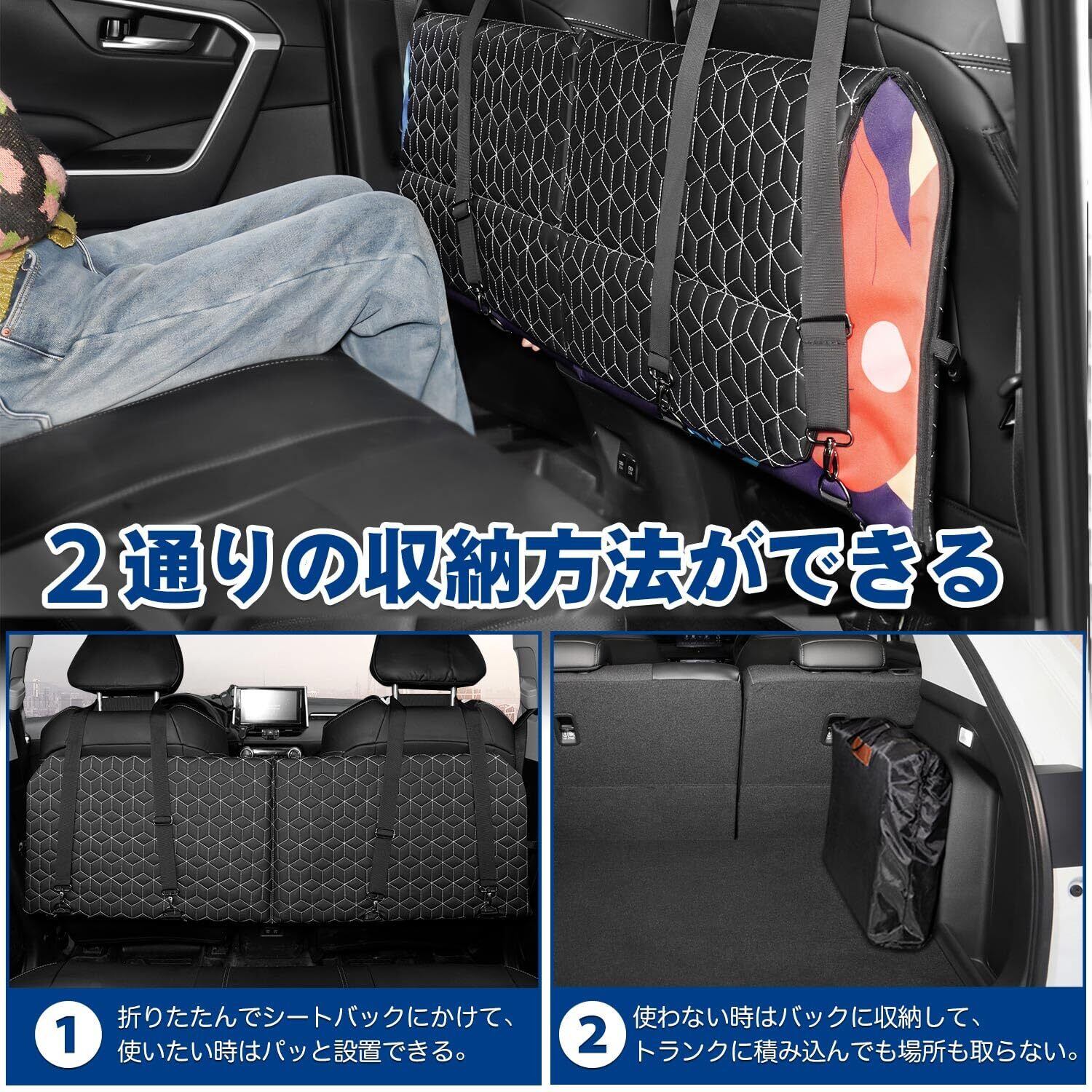 2.【2通りの収納】車中泊マットは折りたたみ式で2通りの収納方法があります。①そのまま折り畳んでシートバックにかけて、次回使用したい時にパッと設置することができまのでとても便利です。②収納バックが付きで使わない時はトラックに積み込んでもスペースがまだまだ余裕!収納にまったく困りません!