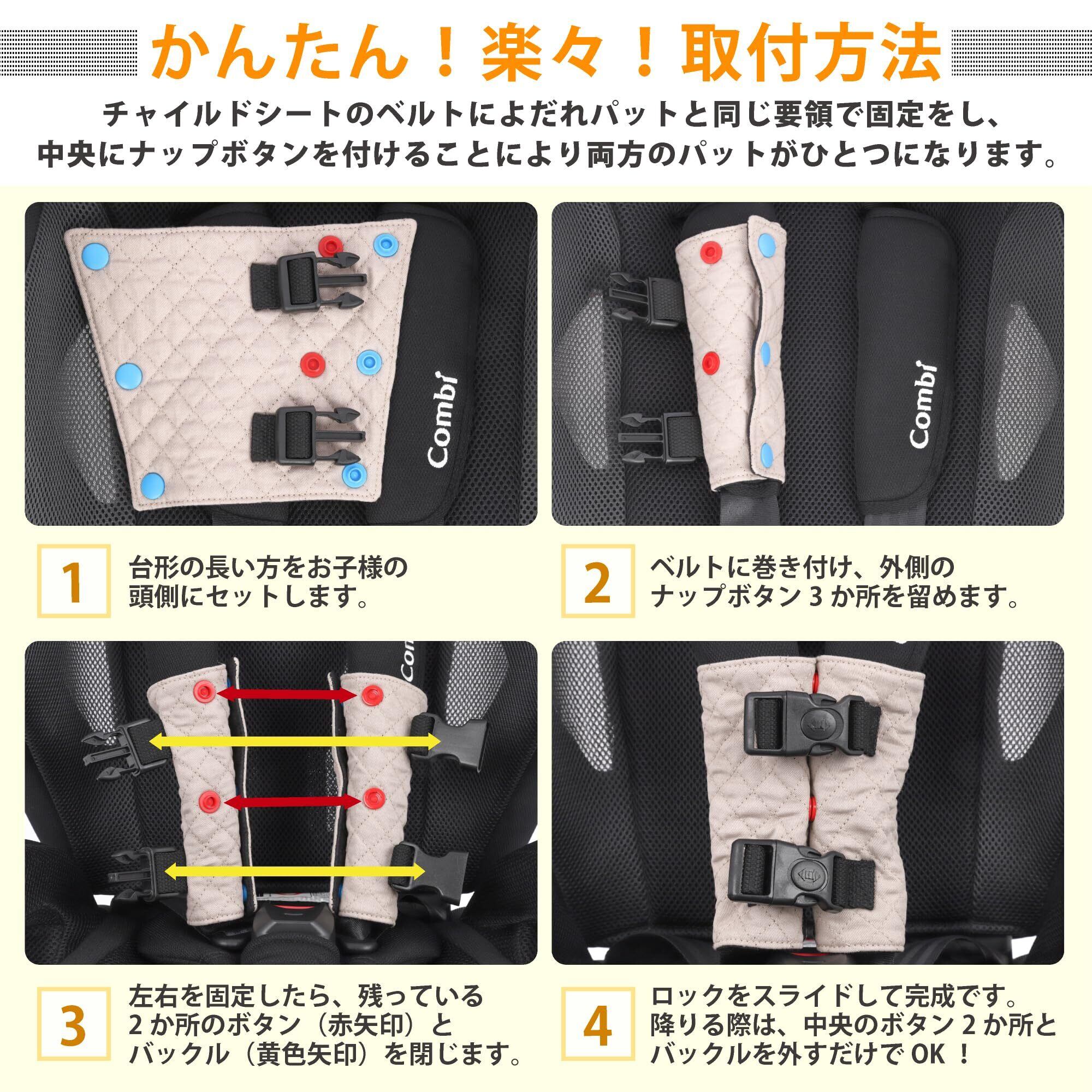 【取り付けかんたん】 このシートベルトカバーは、数多くのベビーチェア、ベビーシート、ベビーカーに取り付け可能! 取り付けることでベルトの肩を外したり、最悪シートから落ちたりする心配はなくなります。 お子様をベビーカーに乗せているときや、チャイルドシートに乗せて運転したりする時も安心です。