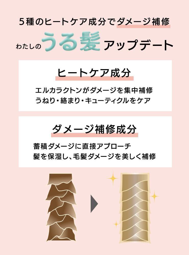 【熱ダメージ補修でうる髪アップデート】 5種のヒートケア成分*が髪の内側・外側から熱ダメージを補修し、毛先までしなやかな髪をキープします。ダメージ部分に吸着・補修することでキューティクルを持続的にケアし、ロックしたスタイルが長持ちに。さらに、指通りが良く、髪にハリ・コシ・ツヤを与えます。*γ-ドコサラクトン、セテアラミドエチルジエトニウムサクシノイル加水分解エンドウタンパク、ラノリン脂肪酸コレステリル、ジラウロイルグルタミン酸リシンNa、加水分解ケラチン(羊毛)[ヘアコンディショニング剤]