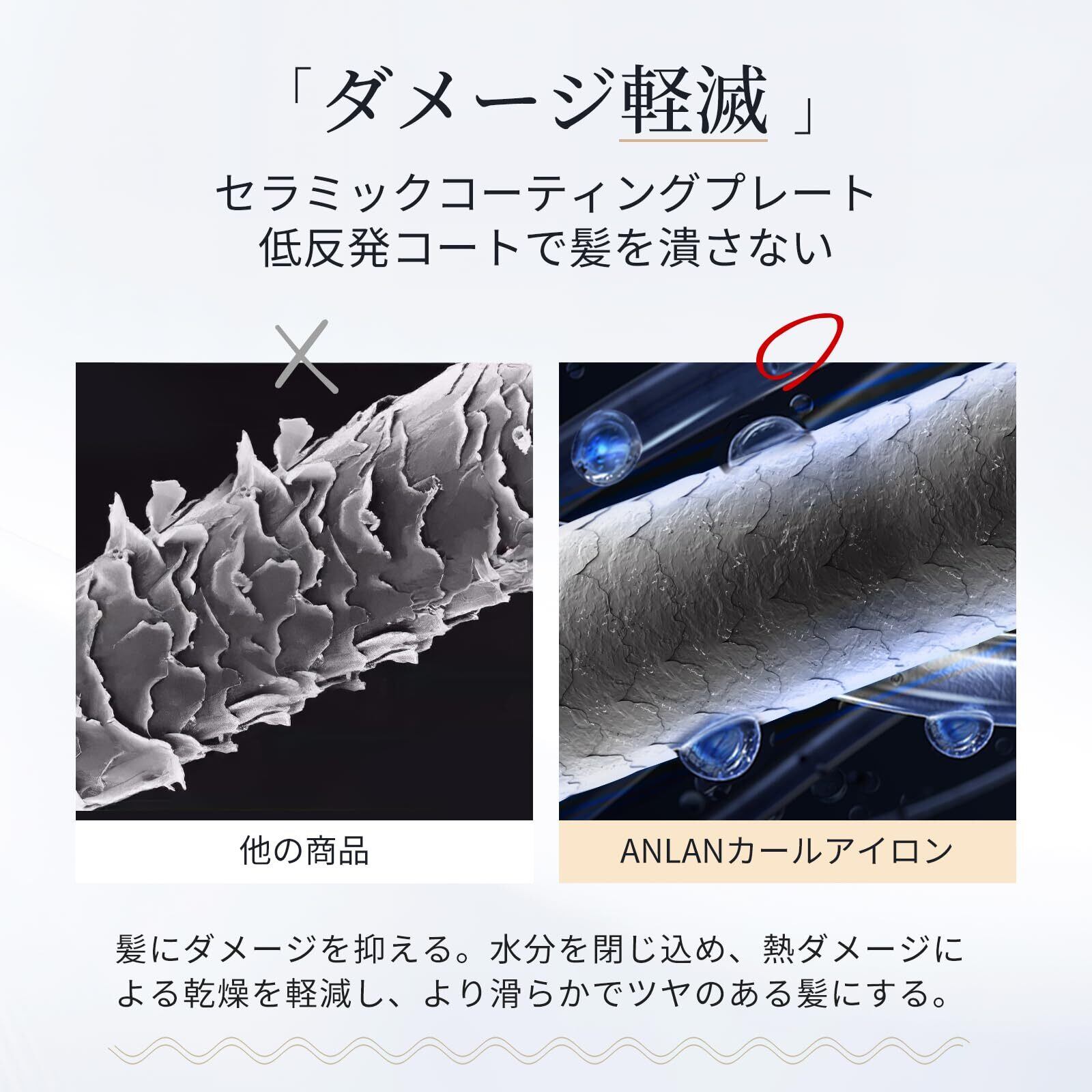 【ANLAN独自技術】「セラミックコーティング·アルミニウムプレート」で水分を閉じ込め、熱ダメージによる乾燥を軽減し、髪をより滑らかでツヤのある状態に保ちます。均一に熱を伝え、長時間カールも立体感が持続します。