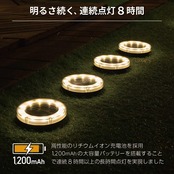 【製品仕様】 明るさ:16ルーメン、カラー WARM:3000K / WHITE:6000K、 リチウムイオン充電池:1200mAh 3.7V、連続点灯:最大約8時間(フル充電時)、 防水性能 IP66、サイズ:直径120mm、高さ 30mm、重量:175g/1個、付属品:差込用スパイク(ペグ)×4個 【メーカー1年&充実の】 操作などお困りの際はお気軽に下さい。説明書記載の電話番号またはメールアドレスから販売店にご連絡ください。営業時間 9:00~16:30 ※では操作説明をしておりません。
