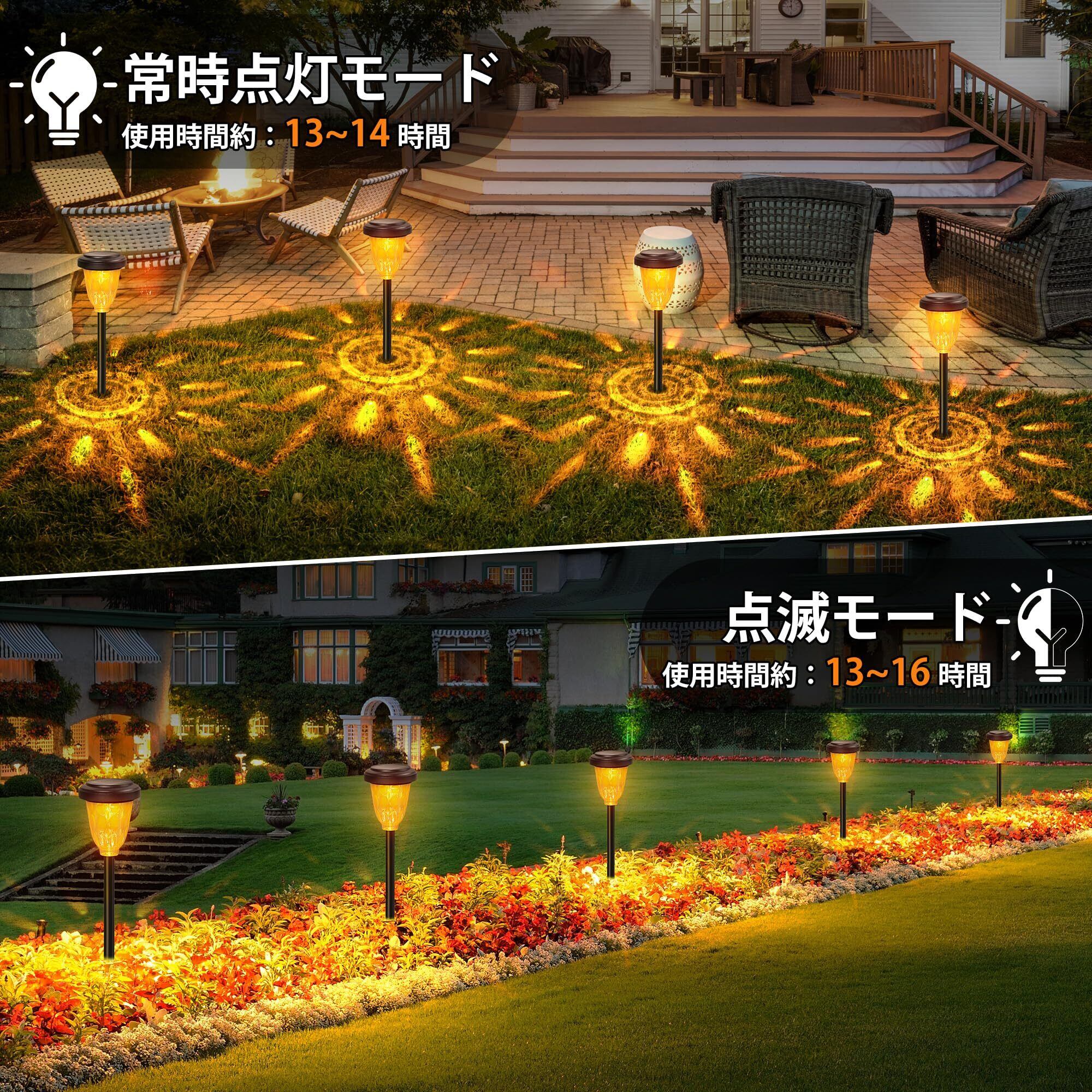 【より高い太陽光の交換効率】35%以上高転換率の増幅されたソ-ラ-パネルを搭載します。庭園灯のリチウムイオン電池1000mAhを搭载して、6~8時間のフル充電後で、最大照明16時間使用可能です。庭 ライト ソーラーがお庭を照らす持続可能な一晩中使えて、ガーデンインテリアに最適!【ご注意】冬場、曇りや雨が続く日などの天候により、ソーラーライトの温度差し込みでは点灯時間が短くなる場合があります。建物の裏側や木陰などに設置したり、充電したりしないで、商品がフル充電されない可能性があります。