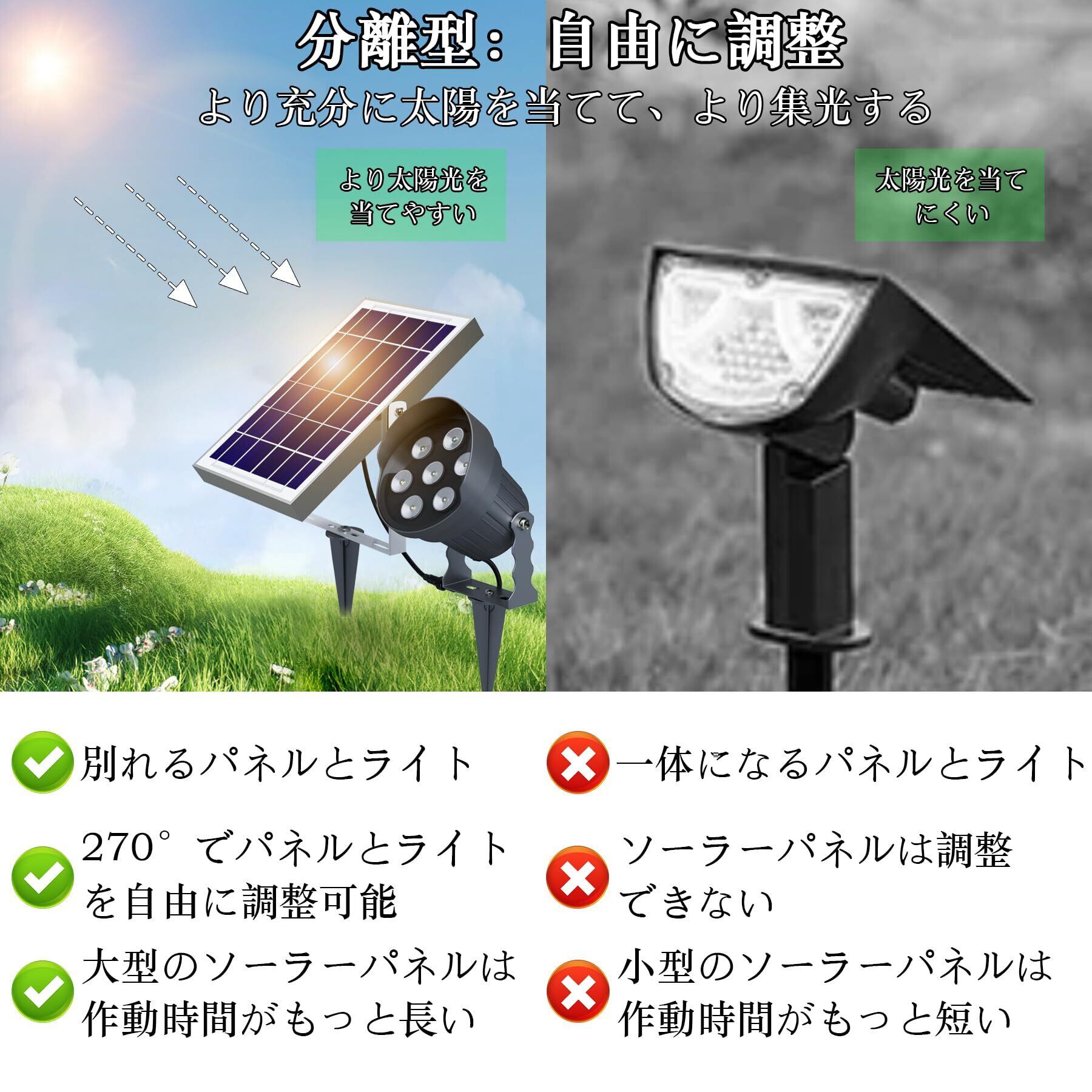 【七つの超明るいledビーズ&照射方向を270°変え&ソーラーパネルと電池容量が大きい】高品質なledビーズを採用して、普通のLEDチップより明るくて、耐久性が良くて、使用寿命は50000時間以上に達する。より明るいソーラー スポットライト 屋外を選択し、歩行に十分なほど足元を明るく照らせて、夜間散歩はもっと安心です。普通のソーラーライト 屋外に比べて、ソーラーパネルが本体と別になっているタイプは、日の当たらない場所にも設置できるのがメリット。二つとも首を270°前後で角度調節可能です。分離型を選択する場合、ソーラーパネルは太陽光に合わせて、当てやすい角度を選べる。しかも、分離型のソーラーパネルはより大きくて、太陽光を吸収したエネルギーも普通のより多くて、光電転換率は35%に達して、蓄積する電力が多くて、夜間の際に連続照明も完全に問題がありません。深い草木の中に置いても角度を調整によって、ソーラーパネルは充分に太陽光を吸収できるし、ガーデンライト 屋外 ソーラーはきっちり草木を照らせて、綺麗なガーデンを楽しめる!