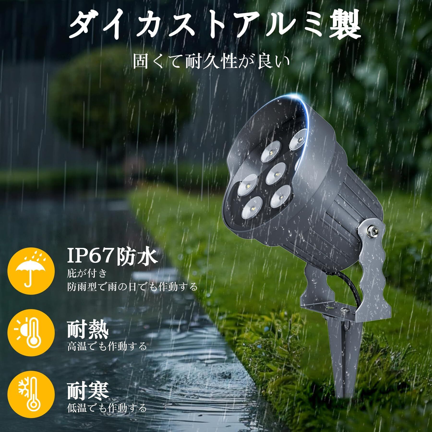 【本体ダイカストアルミ製&IP67防水&耐久性がよい】普通のソーラーライト 屋外はプラスチック製の素材を使用しています。市場調査によって、市販されているプラスチック製のガーデンライト 屋外 ソーラーは防水性能が悪いということです。プラスチック製の本体は太陽光に晒されたり、雨に濡らされたら、劣化しやすいので、切れ目が出て、ガーデンライト 屋外 ソーラーの内部に水が浸入して、作動が停止になって使えなくなる原因となります。本製品は全体でダイカストアルミ製であるため、劣化しなったり水が浸入したりという心配は完全にありません。高品質の素材はソーラー スポットライト 屋外にどんな悪い天気でも正常に作動させることができます。