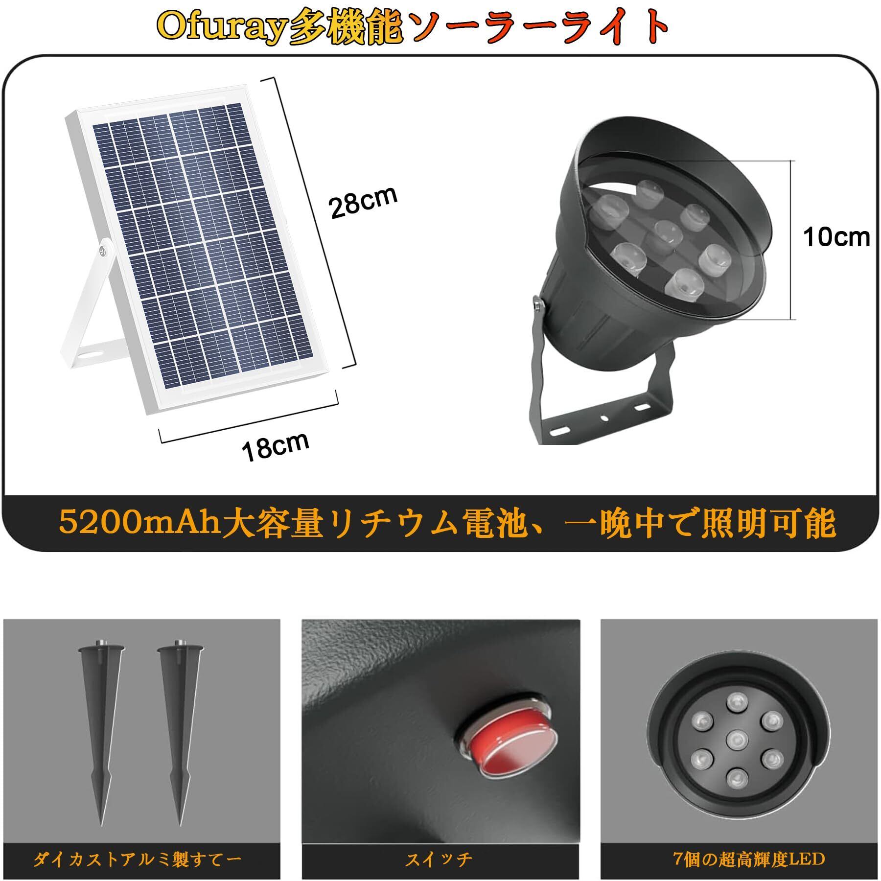 Ofuray ソーラーライト 屋外 三色調色 最も明るい ガーデンライト 屋外 ソーラー 5200mAh大容量 最大15時間照明 ソーラー スポットライト 屋外 分離型 強力 アルミ合金製 IP67防水 270°照射方向変え 差し込み式/壁掛け式/ポール式 芝生/植木/ガーデン ライトアップ 日本語説明書付き