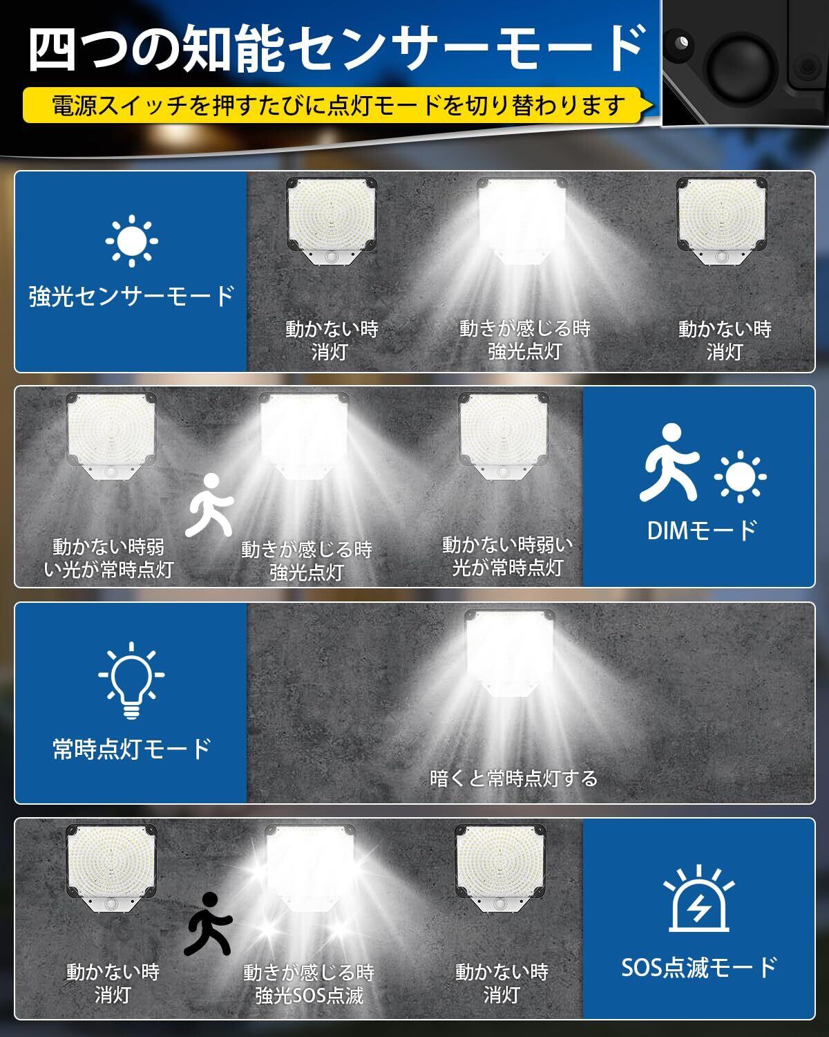 【四つの知能センサーモード】一回目押すると【強光センサーモード】になる:夜間に動きを検知すると、高輝度で約20秒間点灯し続け、その後自動的に消灯します。二回目押しすると【DIMモード】になる:夜や暗くなると、自動的に低輝度で点灯します。 動きを検知すると、約20秒間高輝度で点灯し、再び低輝度で点灯します。三回目押しすると【常時点灯モード】になる:夜や暗くなると、自動的に低輝度で点灯しています。四回目押しすると【SOS点滅モード】になる:夜間に動きを検知すると、高輝度でSOS点滅になって、その後自動的に消灯します。防犯ライトとして、侵入時にフラッシュの光で威嚇撃退!