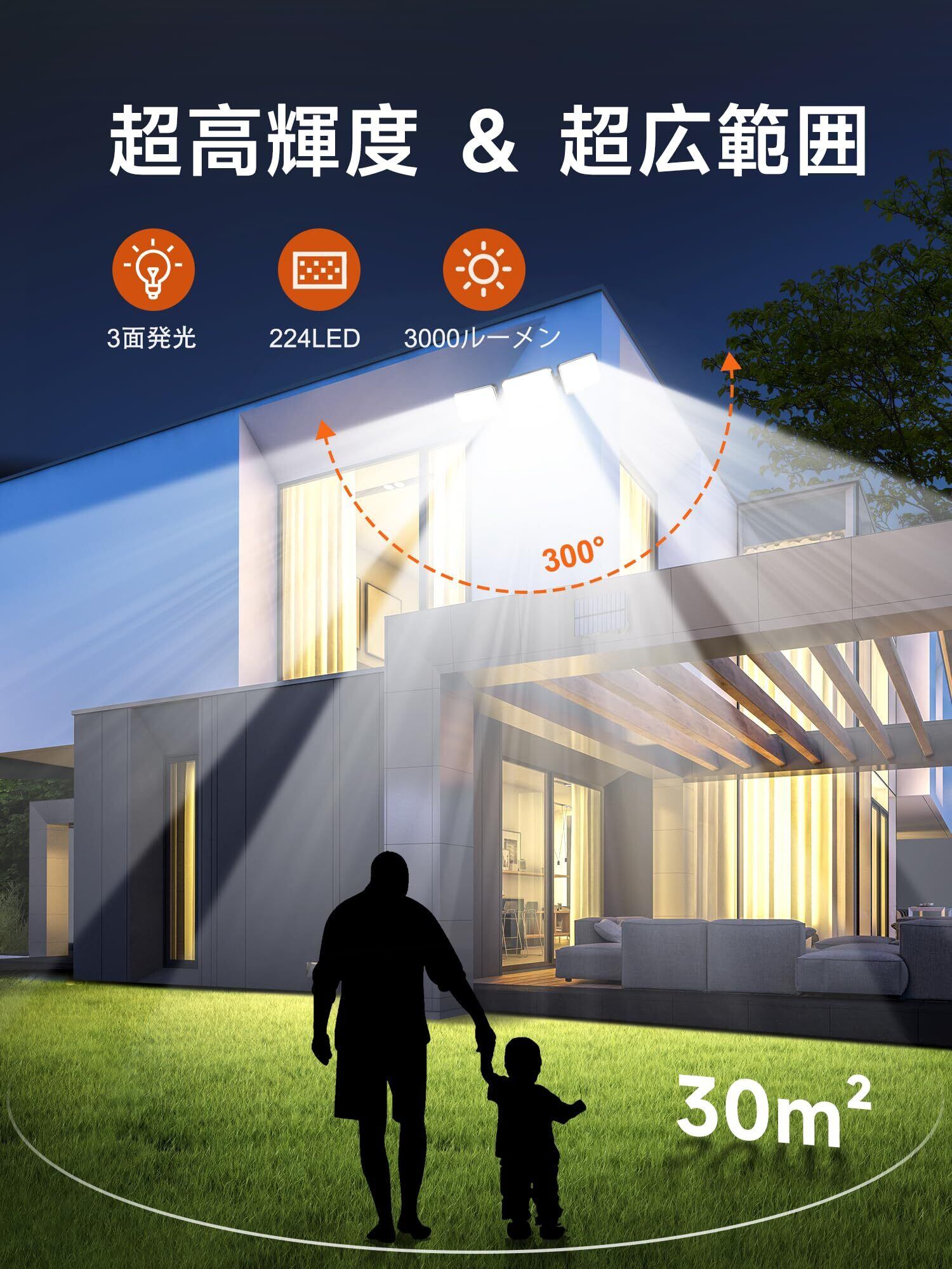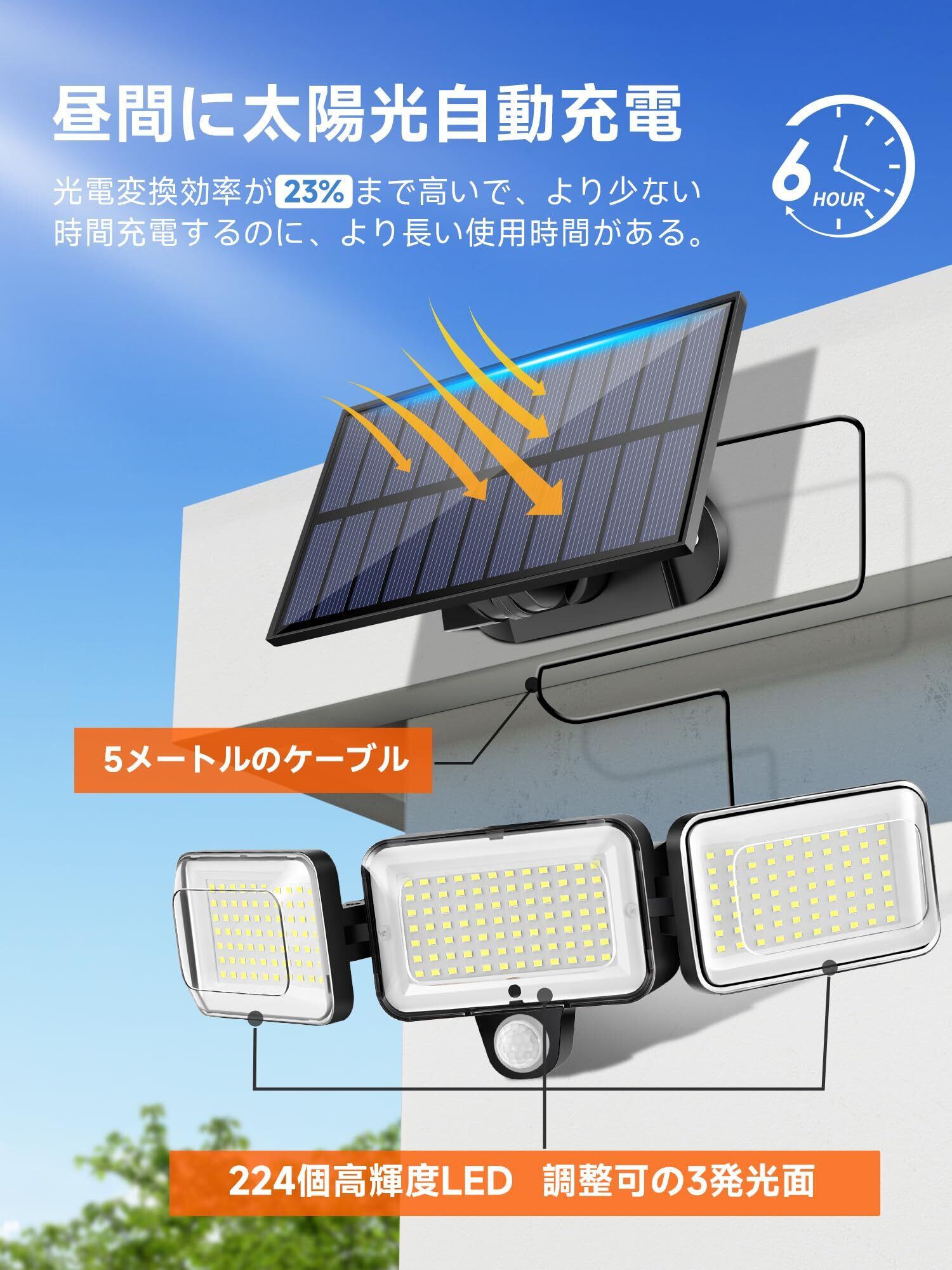 【3000ルーメン超高輝度+3面発光の224LEDソーラーライト屋外】ソーラーライトの輝度不足を心配していますか?少しの心配も要りません。人感センサー付きのソーラーライト屋外、人感センサーライト屋外は224LEDがあり、3000ルーメンの高輝度に達することができる。従来のソーラーライトと比べて、5メートルのケーブルを付きの分離型のセンサーライトは設置範囲が広くて、充電便利です。このソーラーライト室外は三つの調整可の発光面があり、300°照明角度がに達し、夜間照明の範囲が大幅に広くなります。昇級版LEDチップは低発熱、低赤外線・低UVなので、虫も集まりにくくなっています。