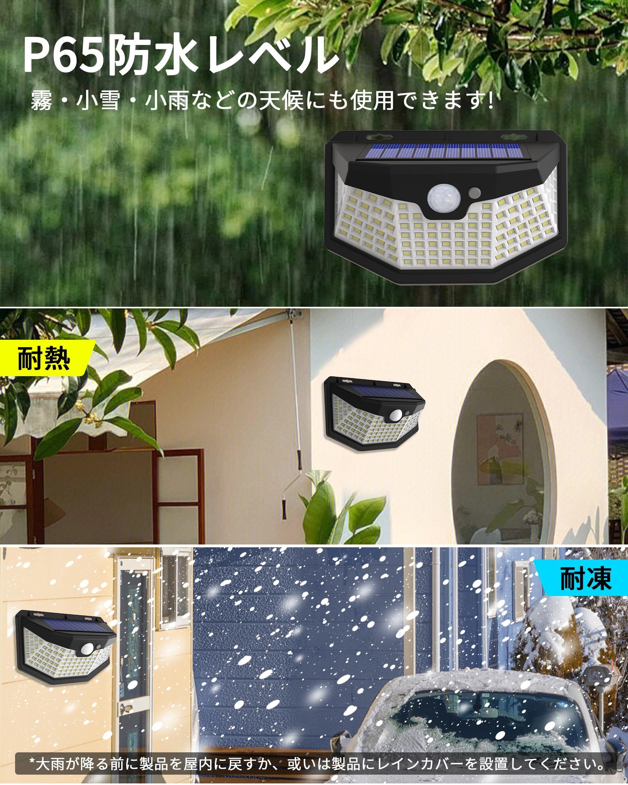 テラス・デッキライト・IP65レベルにデザインして、普通の雨・雪・霧などの天候にもソーラーセンサーライト本体を損害しません。玄関・ガーデン・廊下・駐車場などの屋外場所に大活躍です!弊社のセンサーライトはネジと強力両面テープを付属して、重量にも106.5gだけで、女子でも簡単に設置可能です。
