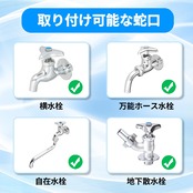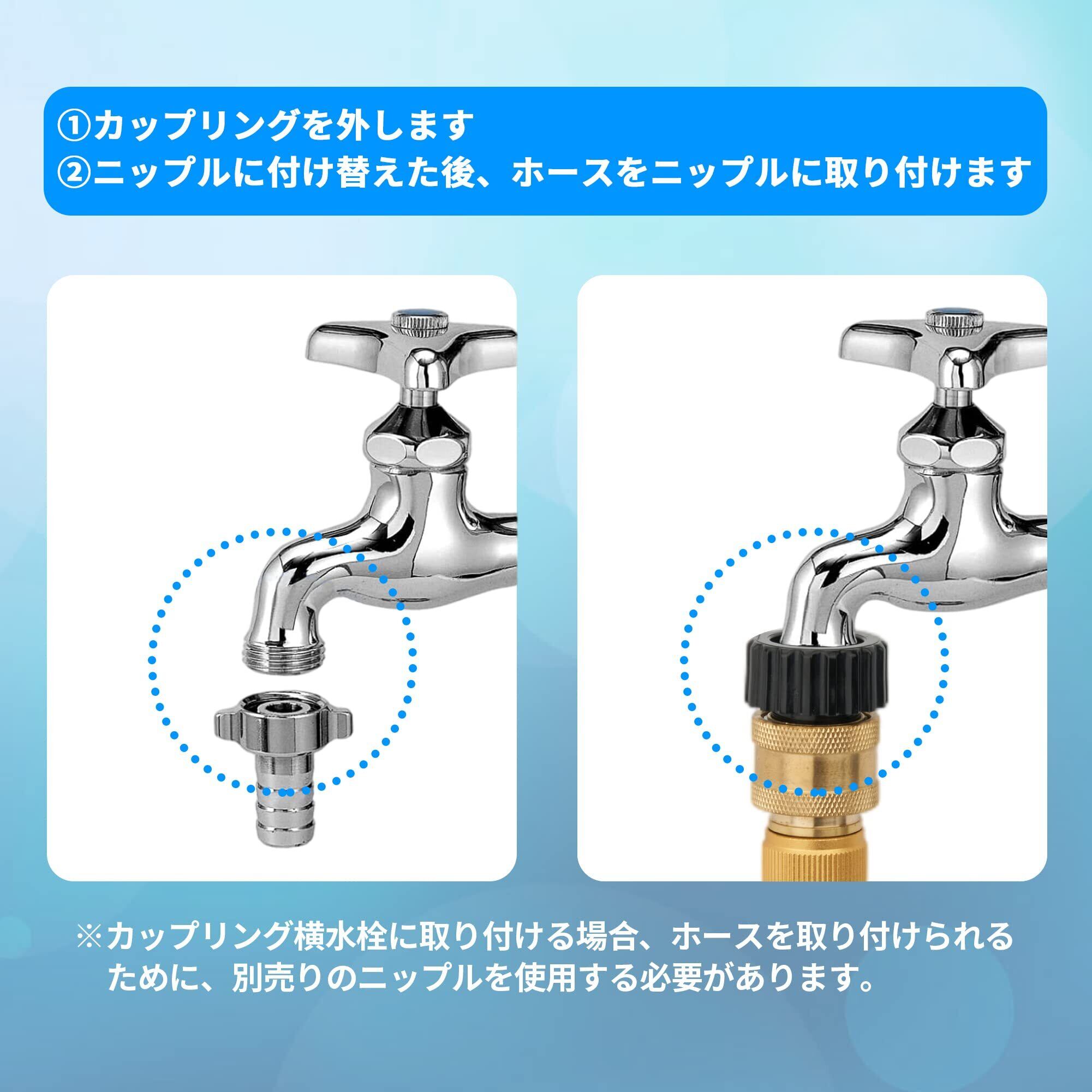 【ご注意】(1)本商品はキッチンや風呂場の蛇口からの使用ではありません。(2)ホースのコネクタはワンタッチタイプではないため、ホースを蛇口に取り付ける前に必ず取扱説明書をお読みください。(3)カップリング付き横水栓を使う場合には別売りのニップルを使用する必要があります。(4)商品パッケージに付属される蛇口用ニップルは直径16mmまでの蛇口の吐水口に取り付けられます。直径16mmより大きい蛇口を使う場合には別売りのニップルを取り付ける必要があります。(5)蛇口用ニップルが取り付けている状態で、蛇口との間から水漏れが発生する場合、蛇口用ニップルを蛇口の吐水口のセンター部に意識して真っ直ぐ押し込み、周囲のネジ(3ヶ所)を更に均等に締め込んでセットしましたところ、水漏れはなくなります。(6)冬に気温が氷点下の環境で散水ノズルを保管しないでください。低温環境で散水ノズルが破損しやすいです。