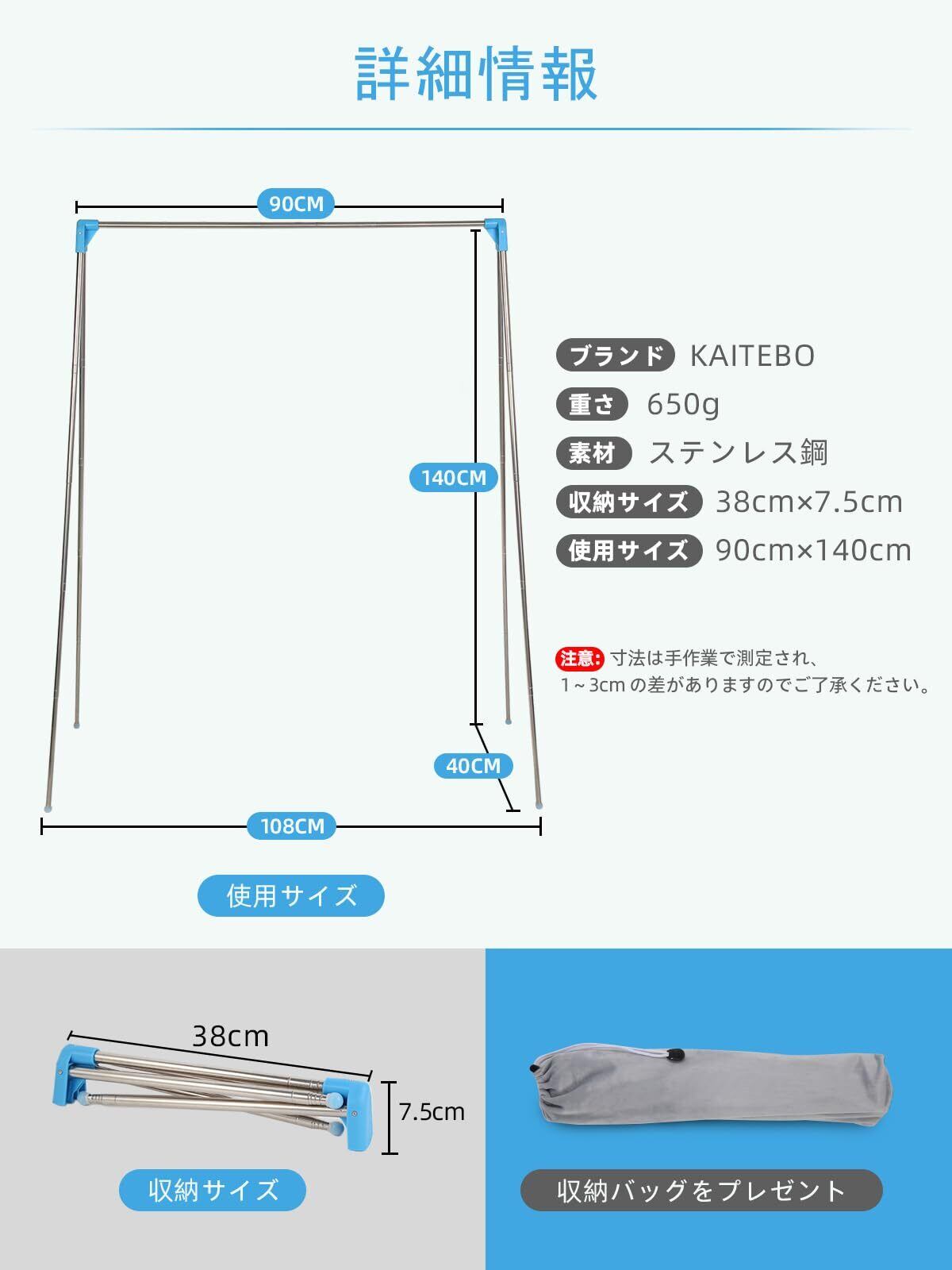 さまざまな場所に適しています】KAITEBO物干しスタンド、屋内でも屋外でも適しています。室内の子ども部屋やベランダ、寝室などにも使え、使わない時は折りたたんだサイズが38.5cm と便利に収納できます。雨の季節には、衣類を乾かすのに最適です。屋外、出張先のホテルやキャンプなどで必要となる、持ち運びに便利な物干しハンガーです。
