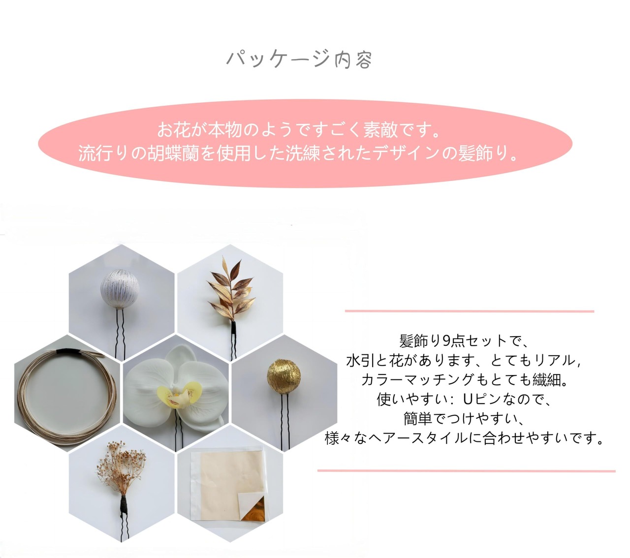 髪飾り9点セットで:水引と花があります、とてもリアル,カラーマッチングもとても繊細。9個のヘアアクセサリーを組み合わせてお気に入りのスタイルにすることも、個別に使用することもできます。今年人気の要素である金箔が付属して,より高級感が溢れます。使いやすい:Uピンなので、簡単でつけやすい、様々なヘアースタイルに合わせやすいです。