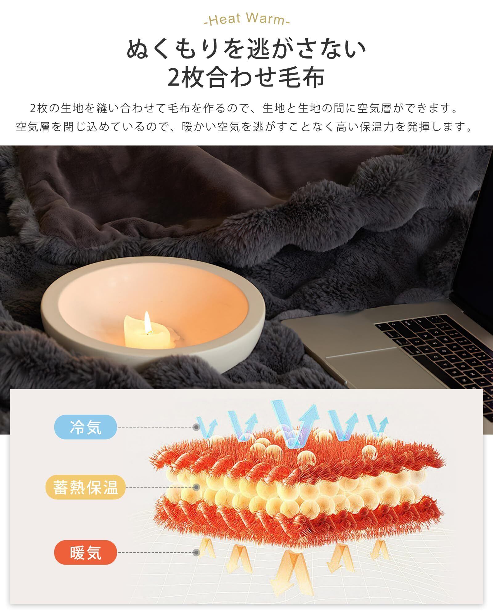 【優れた保温性】 長毛素材のラビットファー調生地が空気をたっぷり含むことで、暖かい空気を逃さずしっかり保温。寒い夜も暖かさをキープし、快適な眠りをお届けします。