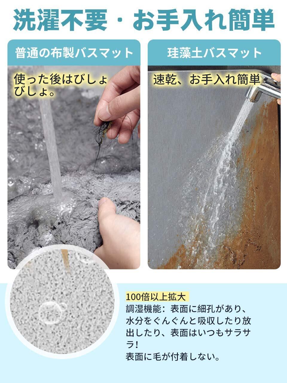 珪藻土バスマットは、「呼吸する土」とも呼ばれる天然素材を採用しており、吸湿・放湿を行う「調湿」性能がある。水分を自動的に吸ったり出したりするので、清潔感と爽快感が得らえる。