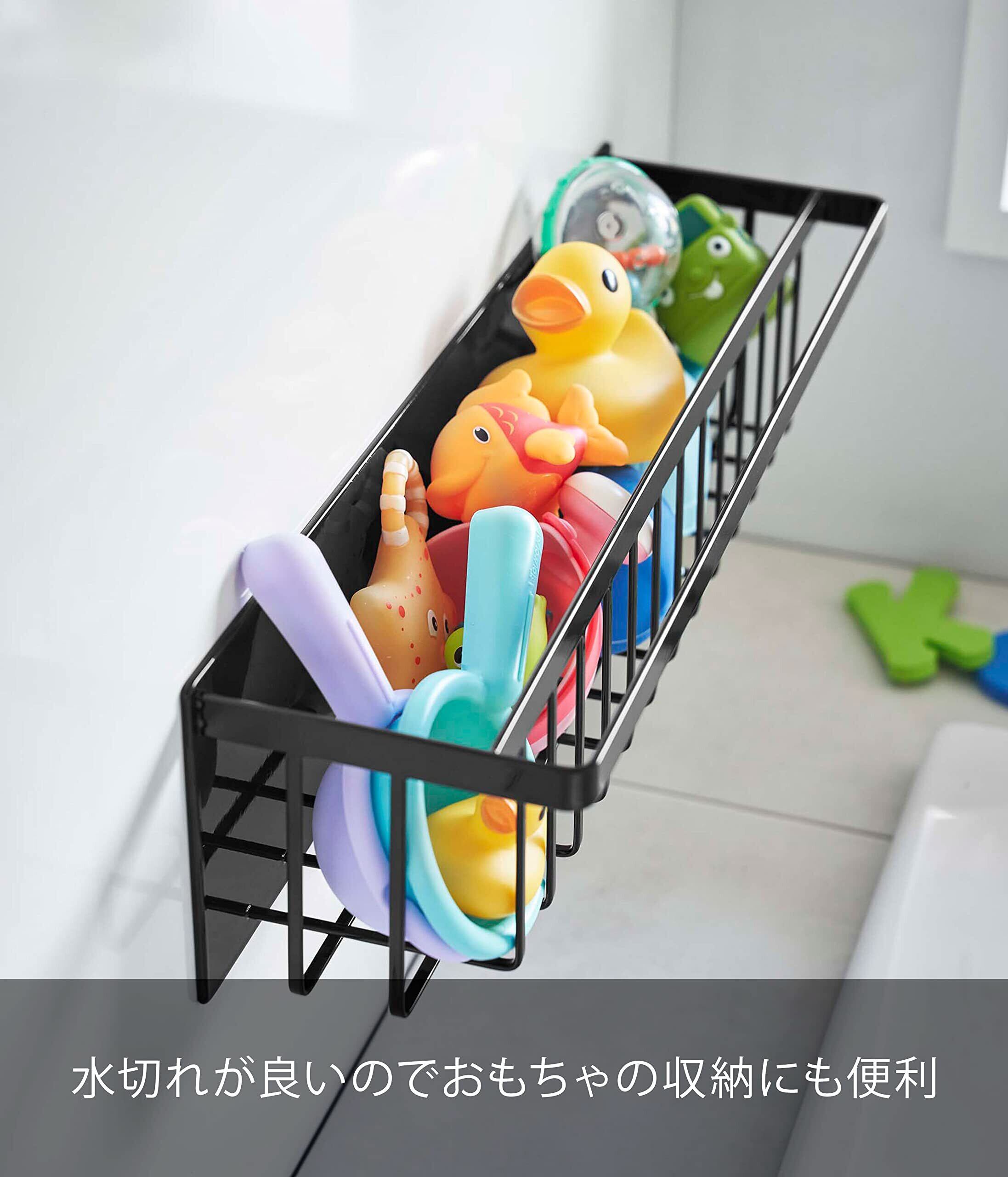 浴室壁面に強力マグネットで取り付けられる奥行スリムなワイドバスケット。