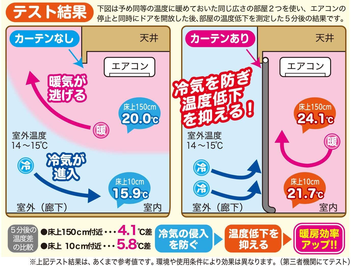 リビングへの冷気の侵入を防ぎ温度低下を抑える間仕切りカーテン。 突っ張りポールに引っ掛けるだけの簡単設置。 取り付け用Cカン付き。