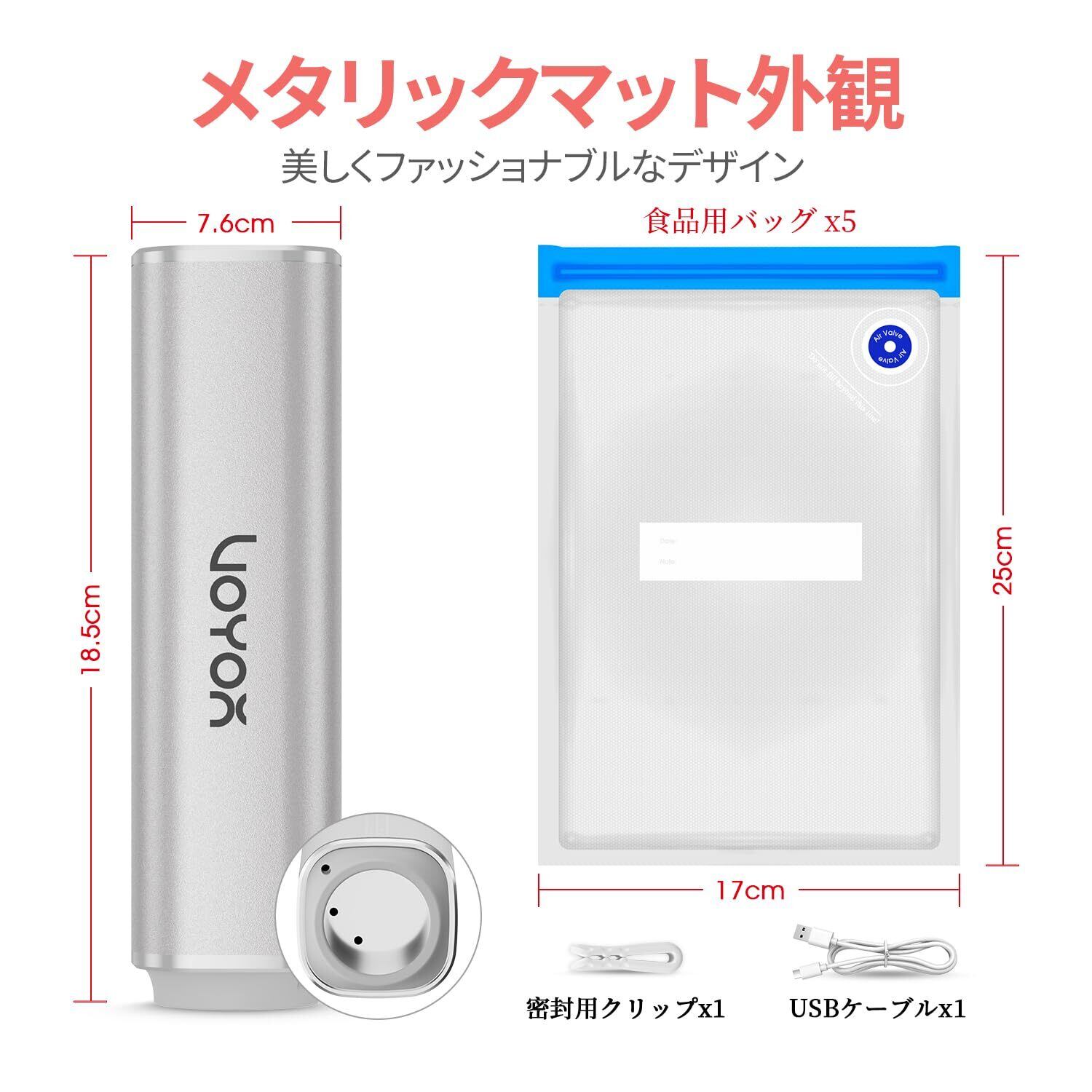 VOYOR 真空パック機 手持ち式 1台+食品用真空バッグ5枚 食品用真空ポンプ ミニ真空パック機 真空保存&省スペース 家庭用 空気抜き 電動真空ポンプ USB充電式 500mAh 60Kpa 吸引力 VS210(銀色)