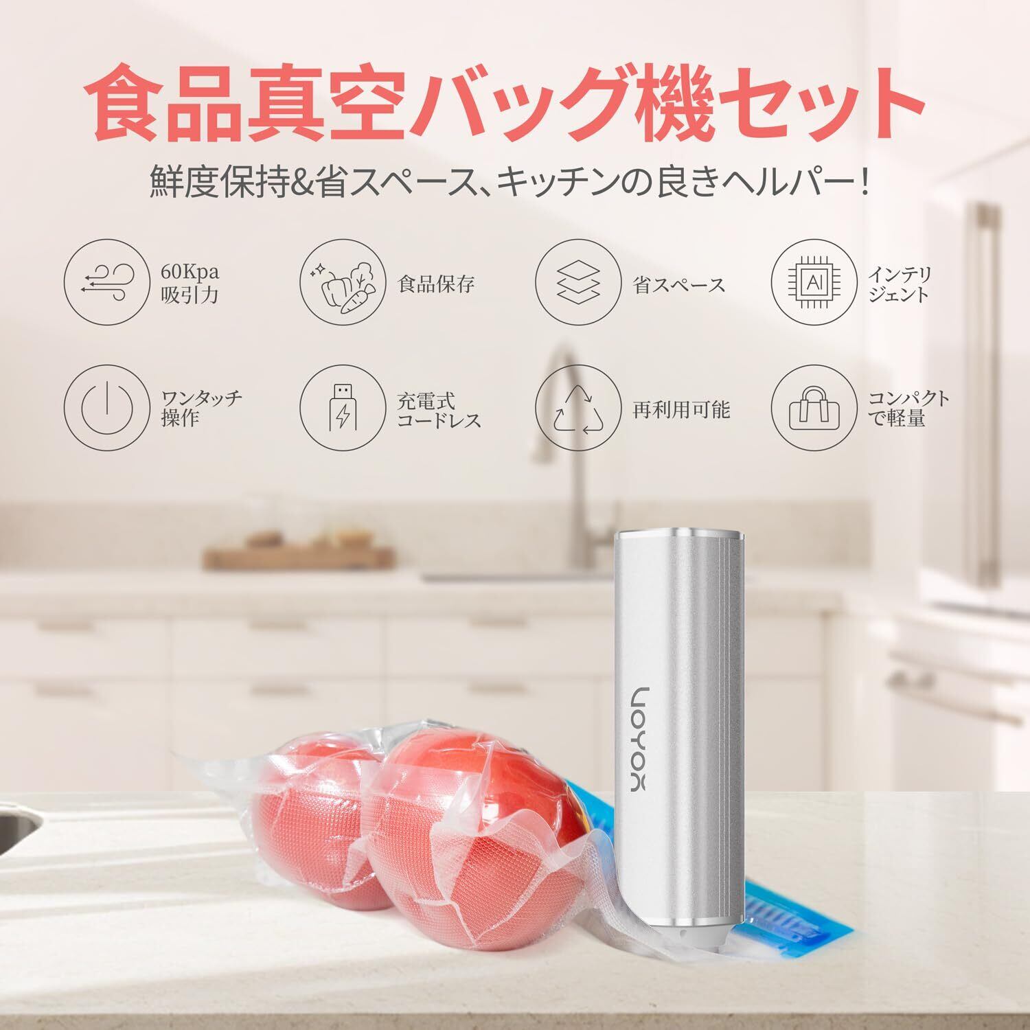 VOYOR 真空パック機 手持ち式 1台+食品用真空バッグ5枚 食品用真空ポンプ ミニ真空パック機 真空保存&省スペース 家庭用 空気抜き 電動真空ポンプ USB充電式 500mAh 60Kpa 吸引力 VS210(銀色) | Lulu