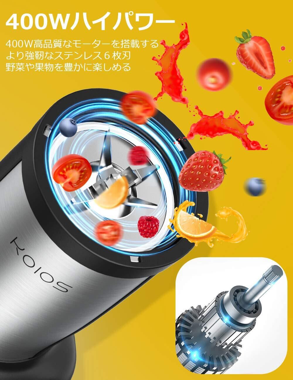 KOIOS ミキサー ジューサー ダブルボトル 500ml大容量 コーヒーミル 6枚刃 ハイパワー400W スムージー 25000r/min高速回転 果物/野菜/離乳食/ミルクセーキ 氷も砕ける 一台多役 栄養補充 過熱保護 水洗い可能 操作簡単 持ち運び おしゃれ アウトドア/旅行/出張/オフィスなどに向け (ブラック) | Lulu