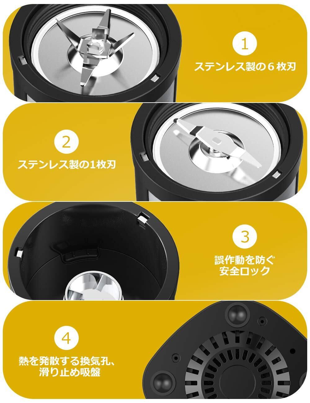 【400Wパワフルミキサー】400Wハイパワーなので、食材の栄養素を最大限に抽出できます。立体の304ステンレス製の回転ブレードを採用し、最高毎分約23,000回の高速回転で、混合効率を大幅に向上させ、繊維のある野菜や果物はあっという間に滑らかなスムージーを作ることができます。食材の栄養素を最大限に抽出し、美味しくて効果的に栄養補給が可能なスムージーを作るのに最適なミキサーです。